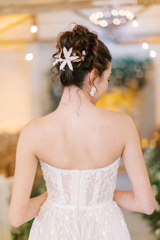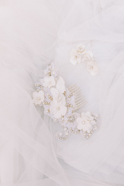Destaque para a grinalda Inês, uma criação que parece ter sido feita para contar histórias: flores em porcelana fria, moldadas manualmente com precisão, dispostas entre folhas e botões em tons suaves de marfim e dourado.